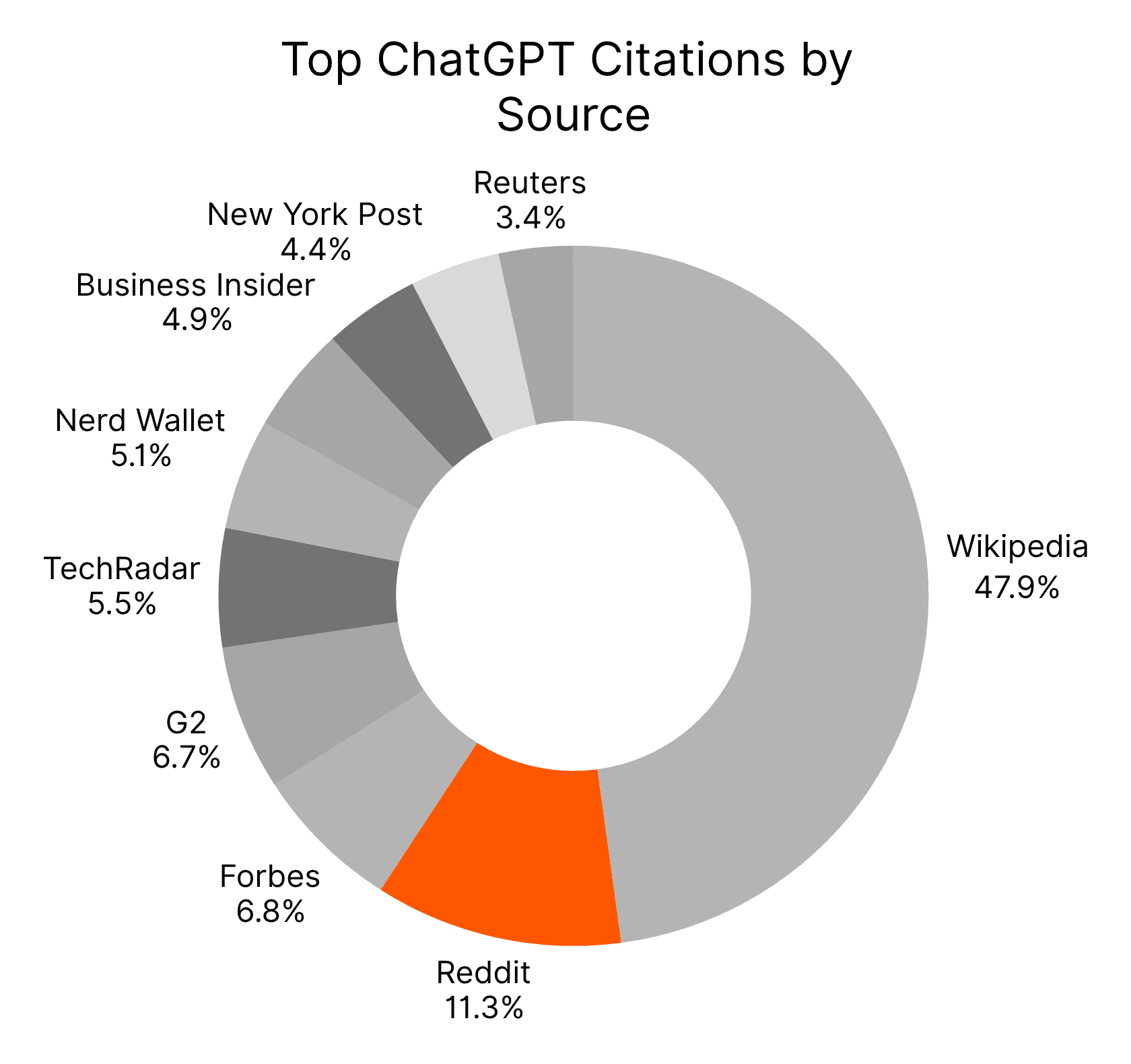 User-generated content from Reddit shapes 11.3% of ChatGPT citations, more than traditional news outlets like Forbes, Reuters, or NYT. It is also the most gameable of the top 10 cited websites.